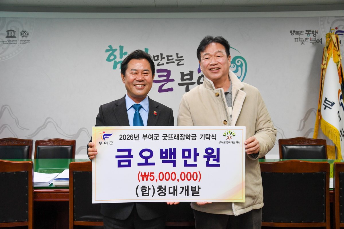 [충청25시] 부여군은 규암면에 소재한 청대개발이 인재 육성을 위한 장학금 5백만원을 부여군굿뜨래장학회에 기탁했다고 27일 밝혔다.