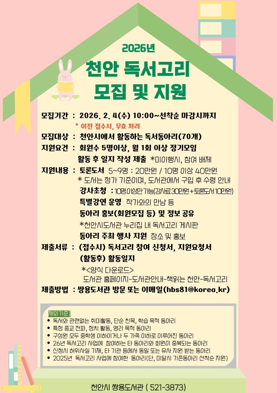 신청은 쌍용도서관 방문 및 전자우편을 통해 가능하며 자세한 내용은 천안시도서관 누리집에서 확인할 수 있다.