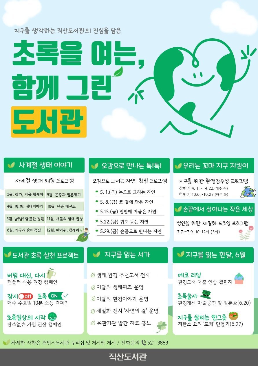 [충청25시] 천안시 직산도서관이 올해 생태와 환경을 주제로 ‘초록을 여는, 함께 GREEN 도서관’을 운영한다고 4일 밝혔다.