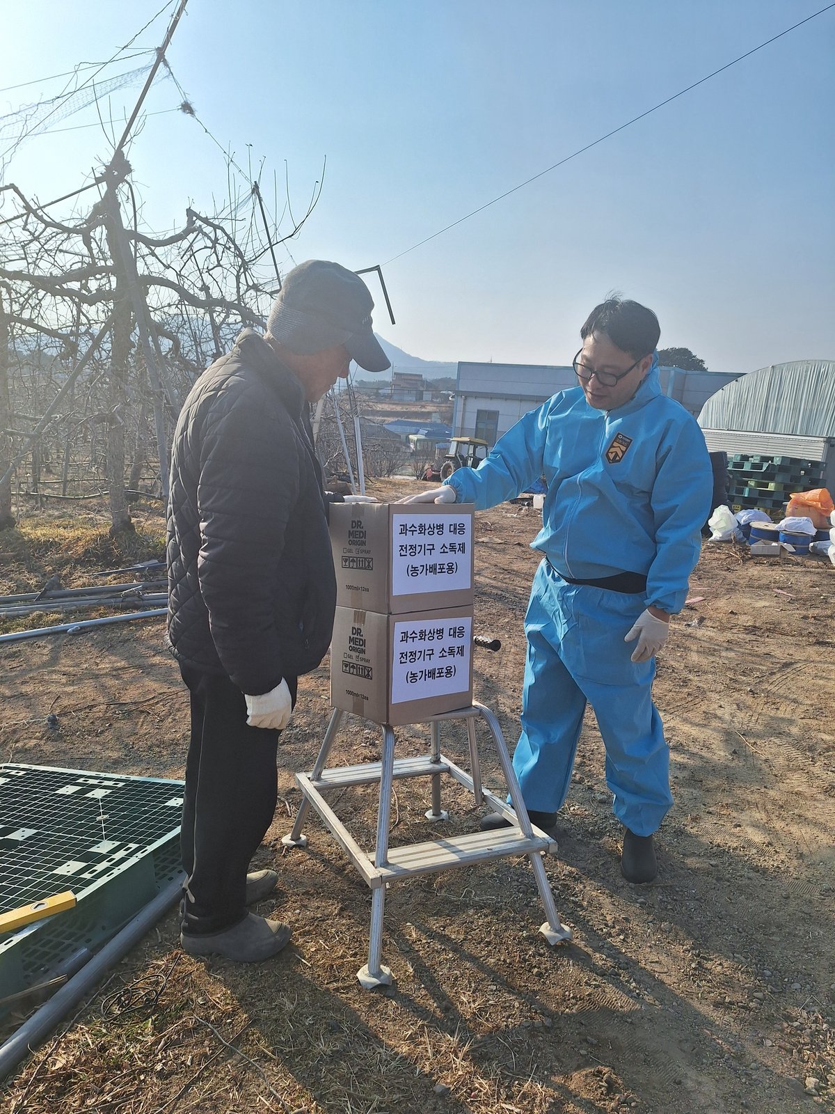 외부에서 유입되는 오염물질 하나가 과수원 전체를 위협할 수 있기에 방문자 출입 시 철저히 소독하고 전정가위나 톱 등 작업도구 또한 마찬가지이다.