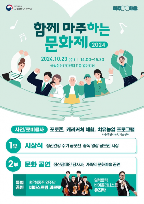 [충청25시] 보건복지부 국립정신건강센터는 10월 23일 오후 2시 국립정신건강센터 열린강당에서 정신질환 당사자의 예술적 가치구현과 정신장애에 대한 인식개선을 위한 ‘함께 마주하는 문화제’를 개최한다고 밝혔다.