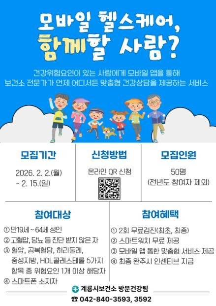 [충청25시] 충남 계룡시는 시민의 자발적인 건강관리 지원을 위해 오는 15일까지 ‘모바일 헬스케어’사업 참여자 50명을 모집한다고 밝혔다.