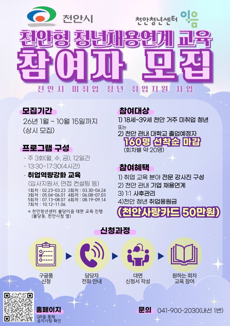 [충청25시] 천안시는 ‘2026년 천안형 청년 채용연계 프로그램’ 참여자 160명을 선착순 모집한다고 27일 밝혔다.