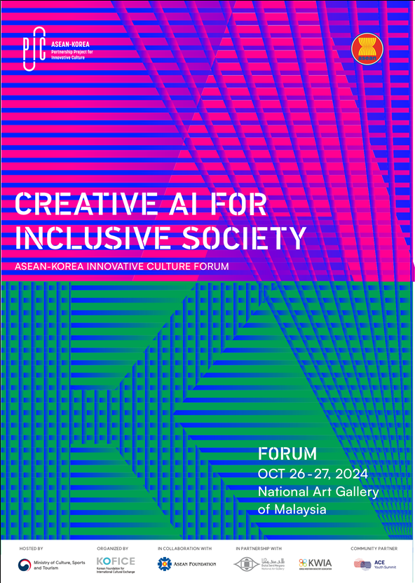 올해는 ‘인공지능과 창조성: 포용적 사회를 위해’를 주제로 인공지능 시대에서 한국과 아세안의 문화예술과 문화산업 분야에서의 창조성을 촉진하고 기술 발전을 포용적 사회 구현으로 이어나가기 위한 다양한 협력 방안을 논의한다.