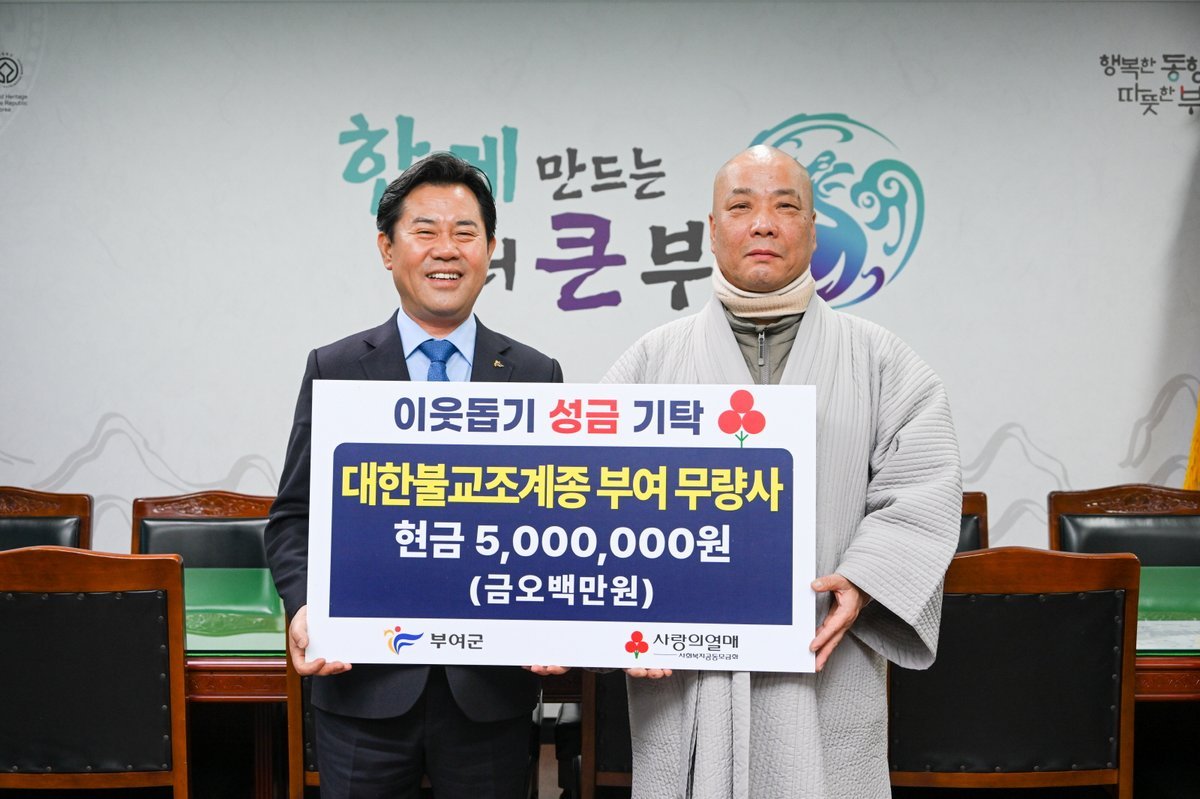 이에 박정현 부여군수는 "설 명절을 앞두고 소중한 정성을 모아주신 무량사와 신도 여러분께 깊이 감사드린다"며 "기탁해 주신 성금은 관내 저소득층과 복지 사각지대에 놓인 이웃들에게 소중히 전달해 따뜻한 공동체를 만드는 데 최선을 다하겠다"고 말했다.