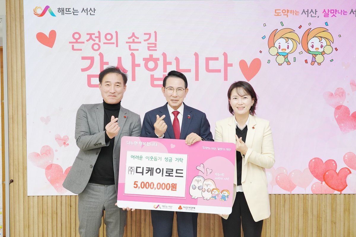 [충청25시] 충남 서산시는 24일 ㈜디케이로드가 관내 어려운 이웃을 돕기 위한 성금 500만 원을 기탁했다고 밝혔다.