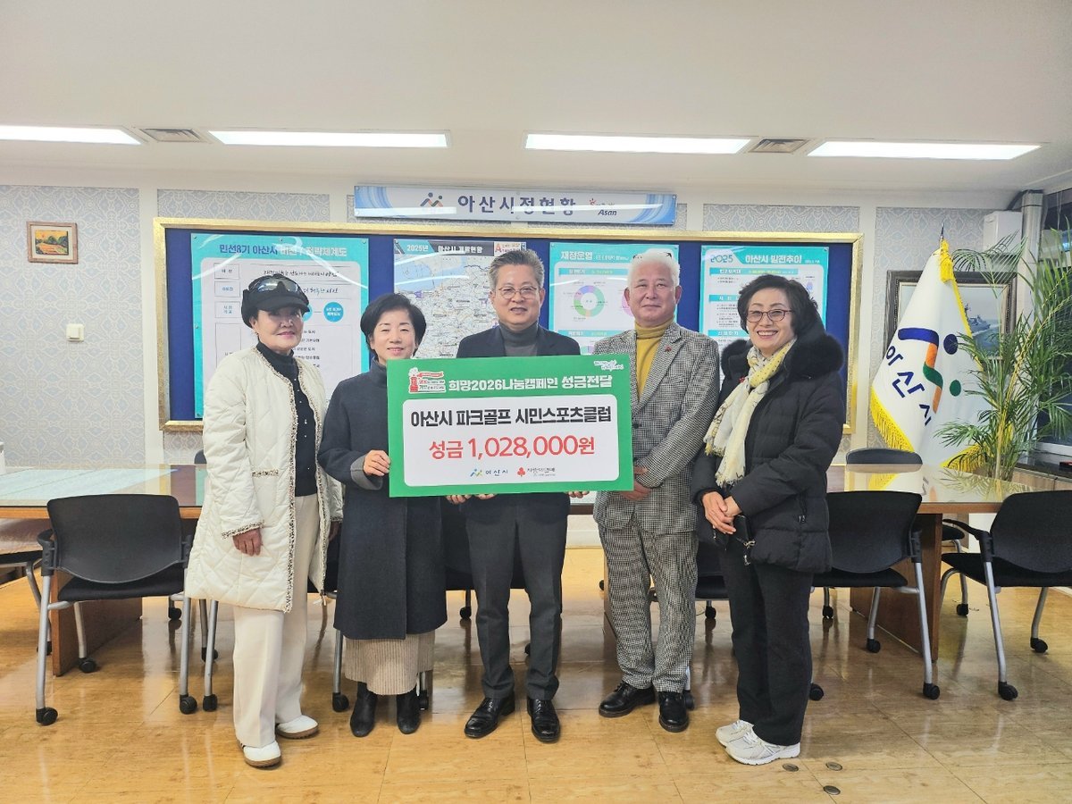 [충청25시] 아산시 파크골프 시민스포츠클럽이 19일 아산시를 방문해 ‘희망2026나눔캠페인’성금 102만 8천 원을 기탁했다.