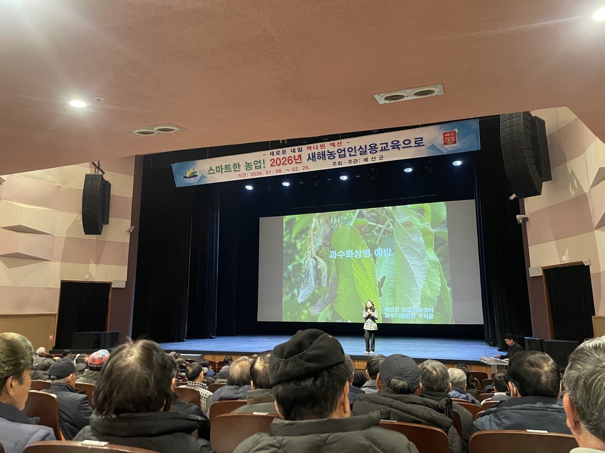 [충청25시] 예산군농업기술센터는 관내 농업인의 역량 강화와 첨단 농업기술 보급을 위해 ‘2026년 새해농업인실용교육’을 1월 8일 사과반을 시작으로 2월 26일까지 실시한다.