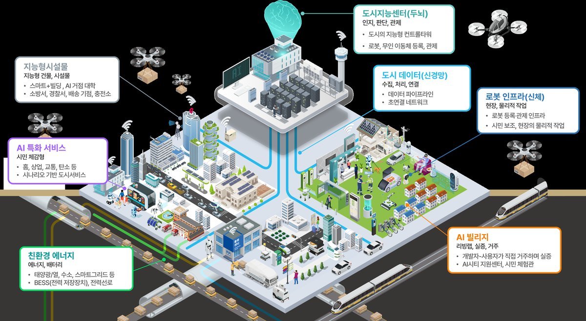 이에 정부는 국가 마중물 사업으로, AI 학습용 도시데이터 활용 등 규제특례를 허용하고, AI 인프라를 통한 분야별 AI 연계·학습으로 도시 내 이상징후 감지 및 실시간 대응을 통해 도시문제를 해결, 더 나아가 로봇·자율주행차 등 피지컬 AI도 문제없이 수용·관제하는 AI 특화 시범도시를 조성하기로 했다.