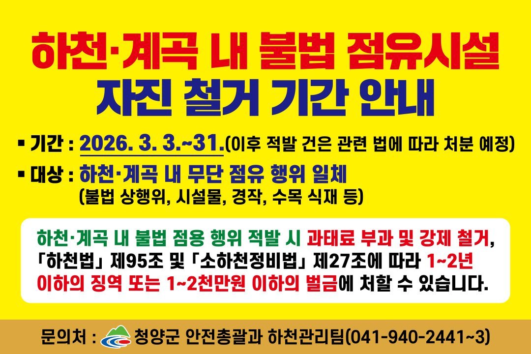 군 관계자는 “하천과 국 공유지는 특정 개인의 소유가 아닌 군민 모두의 소중한 공동 자산”이라며 “무단 점용과 불법 경작은 재해 위험을 높여 우리 이웃의 생명과 재산을 위협할 수 있는 만큼 자진 철거에 적극 협조해 주시길 바란다”고 당부했다.