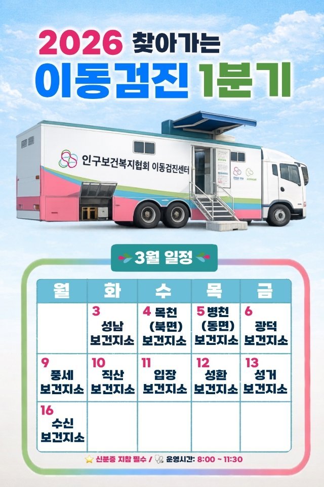1분기 검진은 다음달 3일 성남면을 시작으로 △4일 목천읍 △5일 병천면 △6일 광덕면 △9일 풍세면 △10일 직산읍 △11일 입장면 △12일 성환읍 △13일 성거읍 △16일 수신면 순으로 이어진다.