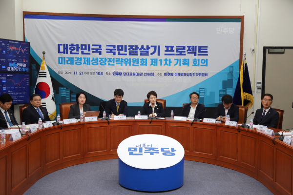 민주당은 21일 국회 본관 당대표실에서 미래경제성장전략위원회 제1차 기획 회의를 개최하고 “유리지갑 두텁게 하기”, “자본시장에서 부자되기” 등 중산층 부흥을 핵심으로 하는 ‘대한민국 국민 잘살기 프로젝트’ 진행을 논의했다.