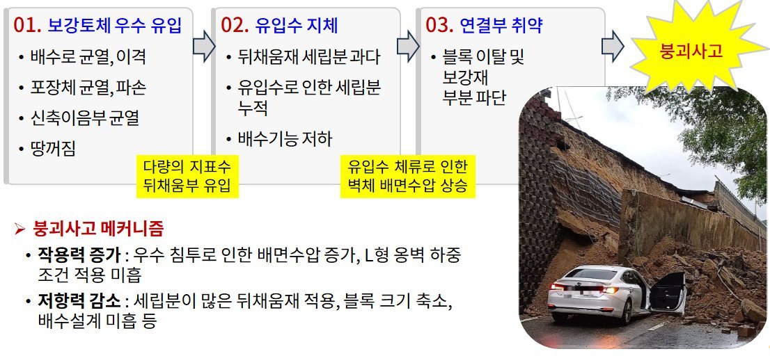 보강토옹벽 상부에 있는 배수로와 포장면의 균열을 통해 보강토옹벽으로 빗물이 지속적으로 유입되어 뒤채움재*가 약화되었고, 보강토옹벽 상단에 설치된 L형 옹벽이 침하되면서 포장면 땅꺼짐과 균열이 발생하였다. 사고 직전 시간당 39.5mm의 집중호우에 의하여 균열과 땅꺼짐 부위로 빗물 유입이 증가하였으며, 이 유입수가 제대로 배수되지 않아 보강토옹벽에 작용하는 압력이 가중되어 붕괴된 것으로 분석되었다.