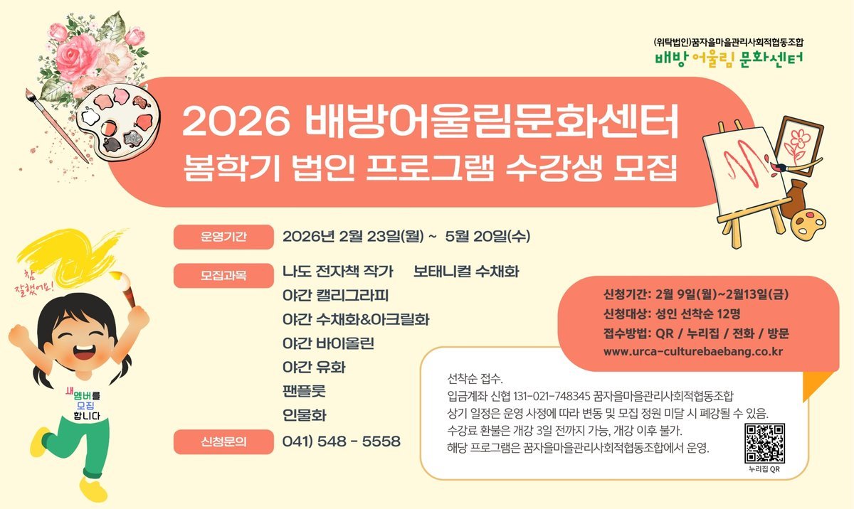 [충청25시] 아산시는 배방어울림문화센터는 2026년 봄학기 생활·문화·예술 교육 프로그램 수강생을 모집한다고 밝혔다.
