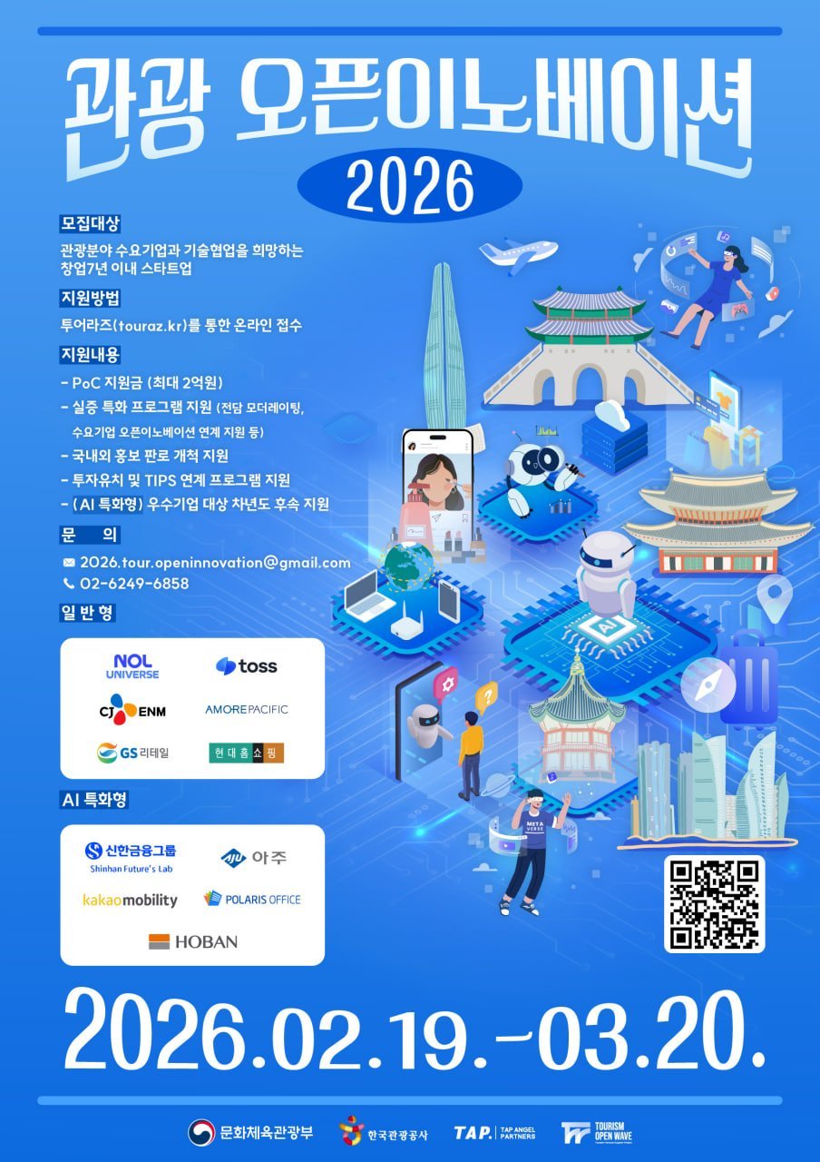 [충청25시] 문화체육관광부와 한국관광공사는 오는 3월 20일까지 ‘2026 관광 오픈이노베이션 사업’ 공모를 통해 대·중견기업과 협업할 관광 스타트업을 모집한다.