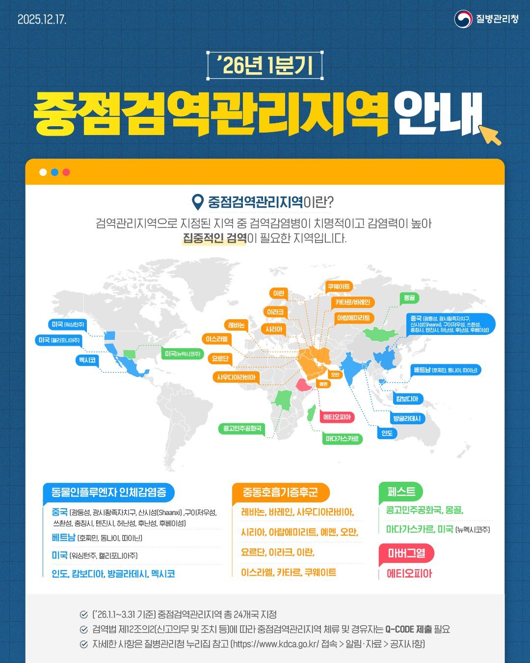 질병관리청은 동물인플루엔자인체감염증, 중동호흡기증후군 등이 발생하여 집중적인 검역이 필요한 국가를 중점검역관리지역으로 지정하고 있으며, 2026년 1분기 기준으로 총 24개국을 대상으로 시행 중이다.