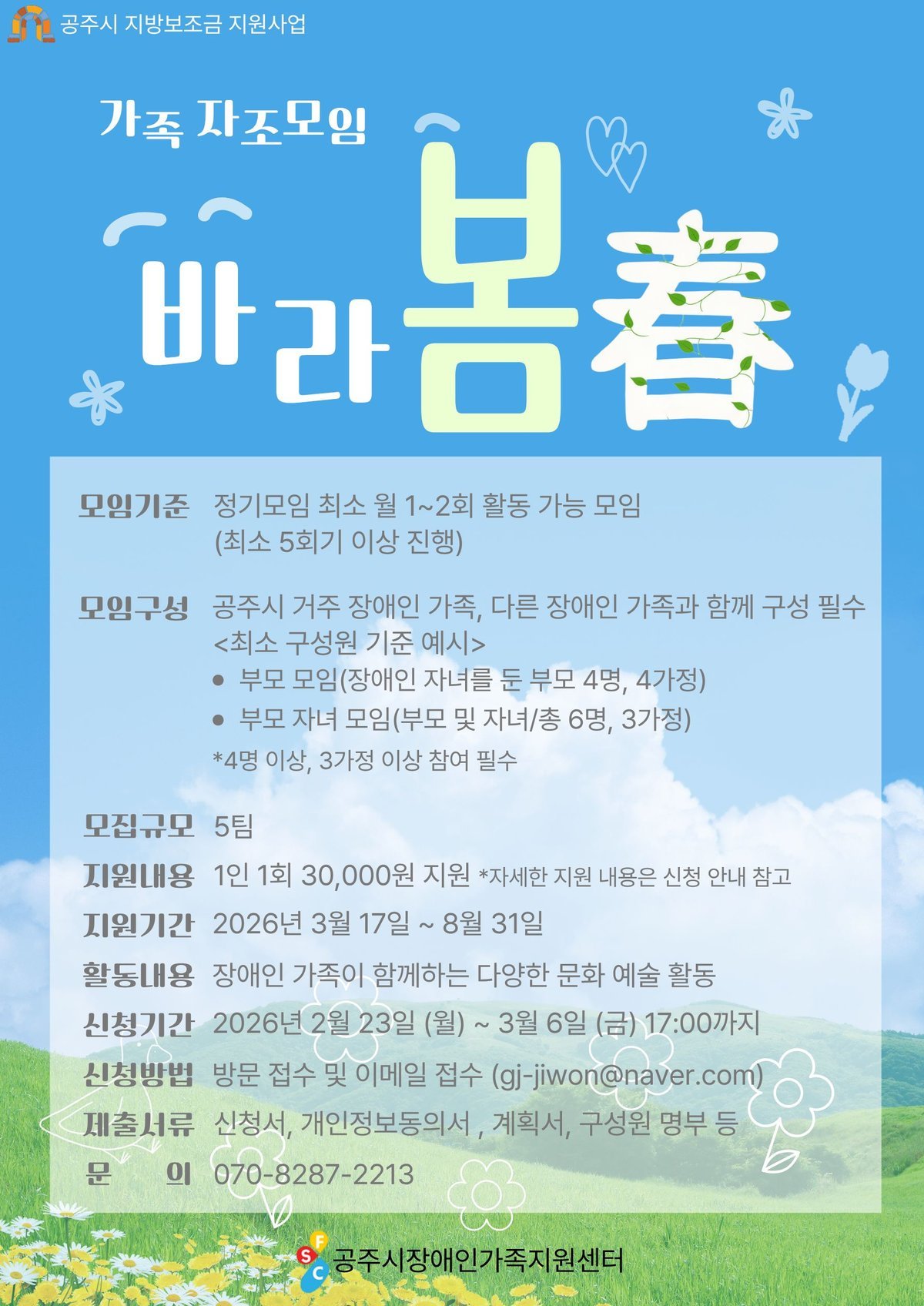 [충청25시] 공주시 장애인가족지원센터는 2026년 장애인 가족을 위한 자조모임 프로그램 ‘바라봄’을 운영하고 참여자를 모집한다고 밝혔다.