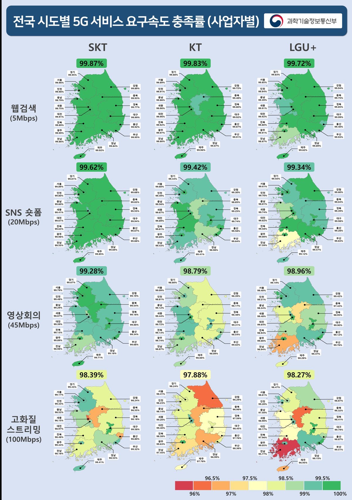 올해 5G 망의 품질평가 결과 서비스별 전국 요구속도 충족률은 5Mbps가 요구되는 웹검색 99.81%, 20Mbps가 요구되는 SNS 숏폼은 99.46%로 모두 99% 이상 요구속도 충족률로 안정적인 품질이 제공되지만, 빠른 속도가 요구되는 서비스로 갈수록 격차가 발생하여 고화질 스트리밍 기준 전국 요구속도 충족률은 98.18%로 나타났다. 사업자별로 SKT 98.39%, LGU+ 98.28%, KT 97.88% 순이다.