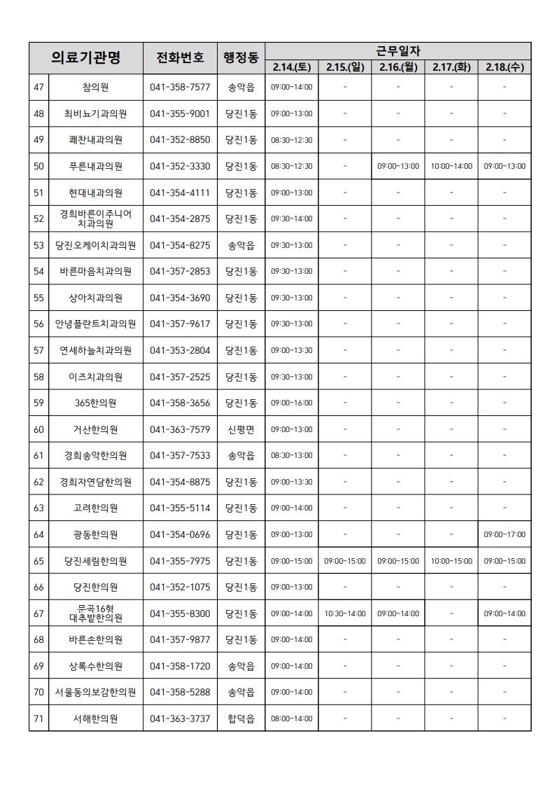 한편, 당진시보건소는 2월 16일과 17일 진료실을 운영하며, 연휴 전 기간 재난 및 다수 사상자 발생 상황에 대비해 ‘응급의료지원반’을 편성하여 즉각적인 대응 체계를 가동한다.