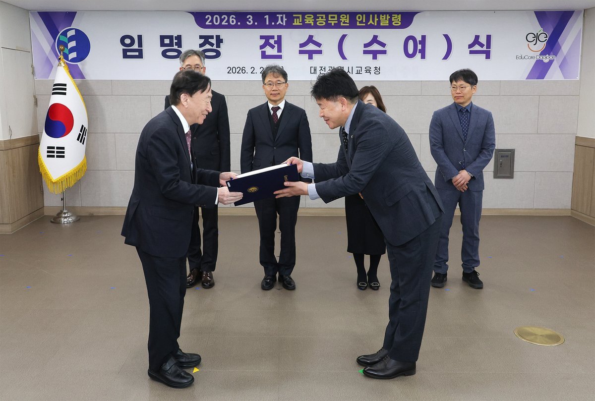 [충청25시] 대전시교육청은 2월 24일 시교육청 701호에서 2026년 3월 1일자 인사발령에 따른 ‘교육공무원 임명장 전수 및 수여식’을 개최했다.