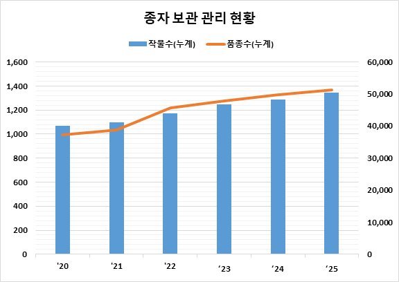 국립종자원 종자검정연구센터는 2014년 설립 이후 국내 유통 종자의 품질과 신뢰 확보를 위해 기술 연구를 수행해 온 전문기관이다. ‘시드큐브’는 이러한 센터의 기능을 실질적으로 뒷받침하는 핵심 시설로, 현재 ‘시드큐브’에는 1,344개 작물, 51,287점의 종자가 보관되어 있다.