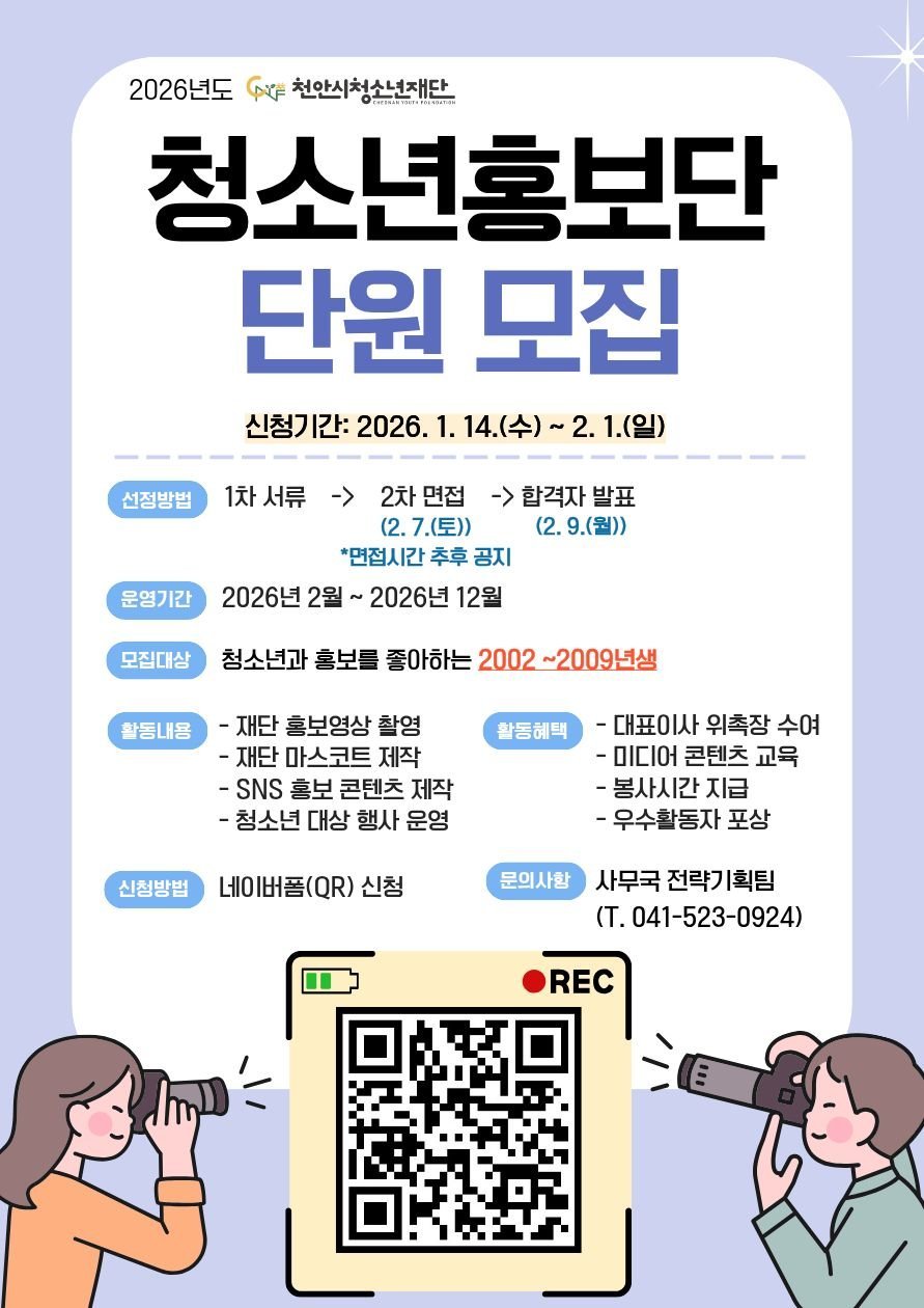 모집 대상은 홍보·미디어·콘텐츠 제작에 관심 있는 천안 거주 또는 관내 학교 재학 중인 17~24세 청소년이며 모집 기간은 다음 달 1일까지이다, 선발된 단원들은 2월부터 12월까지 홍보 콘텐츠 제작, 홍보 부스 기획 및 운영, 재단 마스코트 제작 등 다양한 활동에 참여하게 된다.