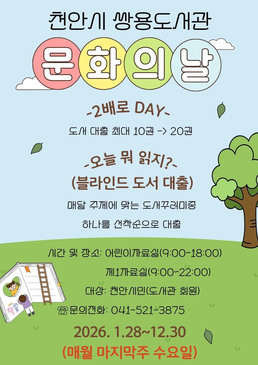 [충청25시] 천안시 쌍용도서관은 매달 마지막주 수요일 ‘2026 문화가 있는 날’행사를 운영한다고 16일 밝혔다.
