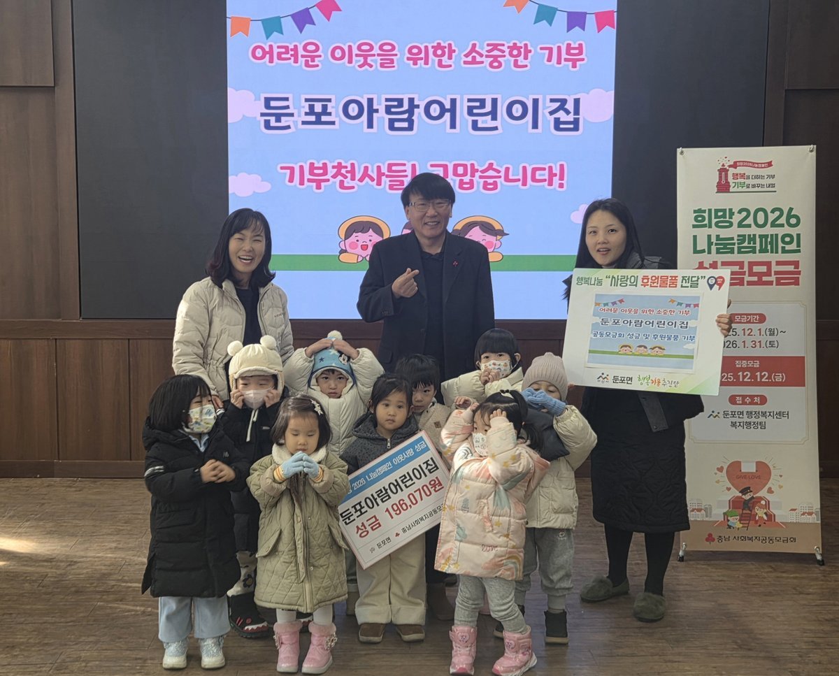 이모완 둔포면장은 “이웃을 위한 나눔에 동참해 준 원아들과 학부모, 교직원 여러분께 감사드린다”며 “정성껏 모아주신 성금과 물품이 도움이 필요한 이웃들에게 잘 전달될 수 있도록 하겠다”고 밝혔다.