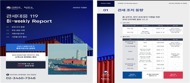 아울러, 산업부는 범정부 관세애로 통합상담 창구인 ‘관세대응119’의 11개 협력기관과 함께 ‘관세대응119 리포트’를 격주 단위로 배포한다. 해당 리포트에는 ①글로벌 보호무역조치 동향, ②범정부 주요 지원사업, ③기업대응 사례 및 전문가 칼럼 등이 담길 예정이다.