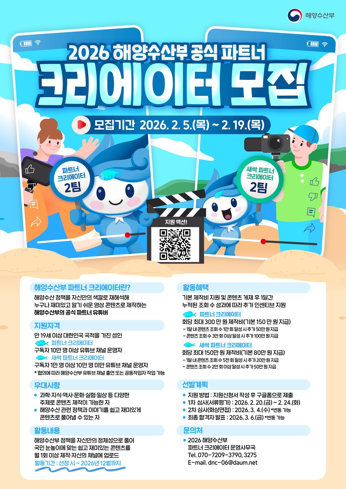 [충청25시] 해양수산부는 2026년 한 해 동안 해양수산 정책을 국민 눈높이에 맞춰 쉽고 재미있게 전달해 줄 ‘2026 해양수산부 공식 영상 협력 제작자’를 2월 5일부터 2월 19일까지 모집한다고 밝혔다.