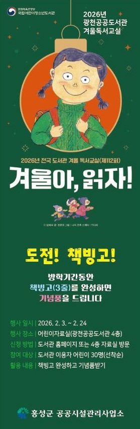 [충청25시] 홍성군 광천도서관에서는 다음달 3일부터 24일까지 어린이 이용자들을 대상으로 한 ‘겨울방학 독서교실’을 운영한다고 밝혔다.