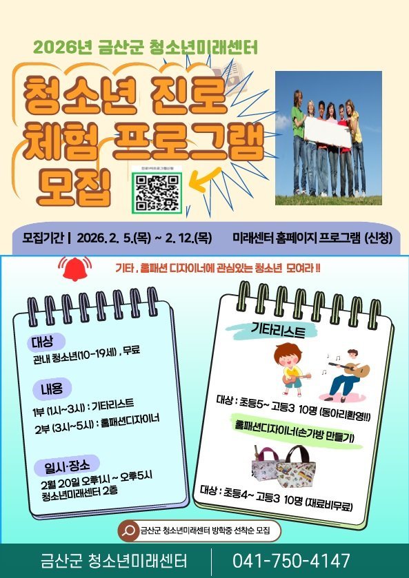 [충청25시] 금산군청소년미래센터는 오는 12일까지 청소년들의 진로 탐색과 직업 이해를 돕기 위한 청소년미래센터 진로체험 1차 프로그램 참여자를 선착순 모집한다.