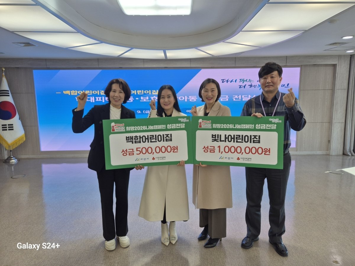 [충청25시] 아산시는 지난 9일 국공립 백합어린이집과 빛나어린이집이 바자회를 통해 마련한 수익금 150만 원을 관내 학대 피해 및 보호대상 아동을 위해 기탁했다고 밝혔다.