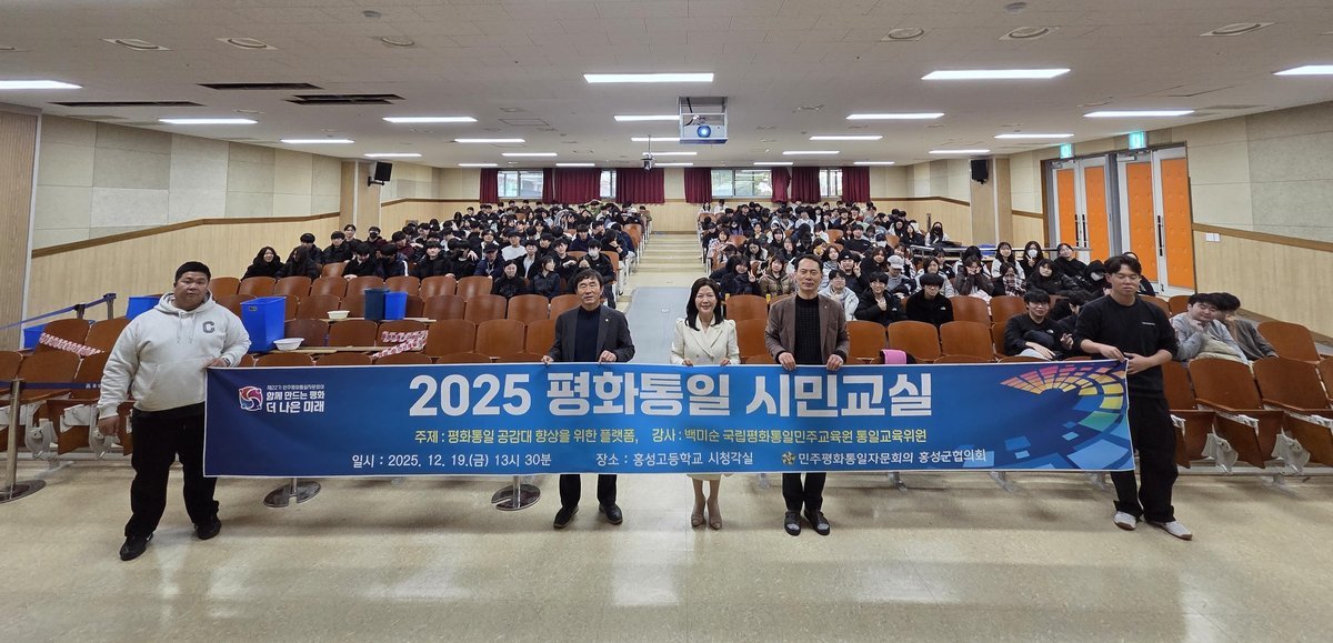 [충청25시] 민주평화통일자문회의 홍성군협의회가 지난 19일 김명률 청년분과위원장의 진행으로, 홍성고등학교 2학년 학생 및 교사 250여 명이 참석한 가운데 ‘2025 평화통일 시민교실’을 개최했다고 밝혔다.