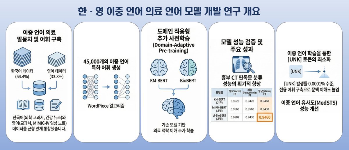 연구를 주도한 주형준 교수는 “이번 연구는 국내 임상 현장 특성을 반영한 이중언어 의료 언어모델을 구현하고, 실제 의료데이터 검증을 통해 임상 적용 가능성을 확인한 점에서 의미가 있다”고 전했다.