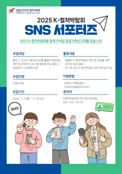 [충청25시] 천안시는 오는 5월 독립기년관에서 열리는 학류문화엑스포 ‘2025 천안 K-컬처박람회’ 온라인 홍보대사인 ‘제3기 SNS 서포터즈’를 모집한다고 6일 밝혔다.