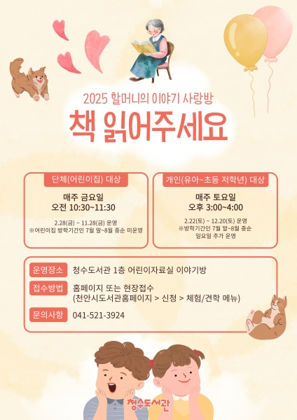 [충청25시] 천안시 청수도서관은 올해도 할머니의 이야기 사랑방 ‘책 읽어주세요’ 프로그램을 운영한다고 20일 밝혔다.