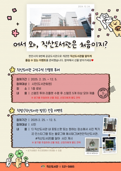 직산도서관에 방문해 시설을 직접 체험한 뒤 스탬프를 5개 이상 모아 제출하거나 사진을 찍어 SNS에 게시하면 분기별로 추첨을 통해 선물을 제공할 예정이다.