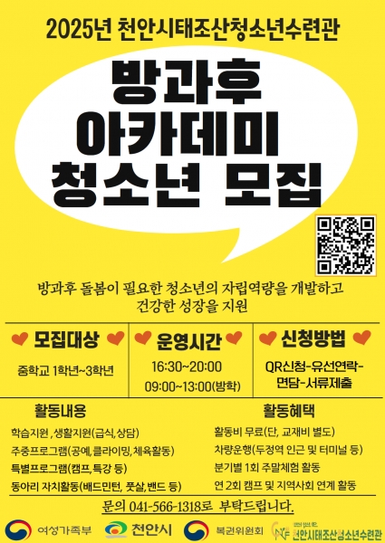 방과후아카데미 모집 대상은 천안에 거주하거나 학교에 재학 중인 중학교 1~3학년 청소년이며 신청은 포스터의 큐알코드로 하면 된다.