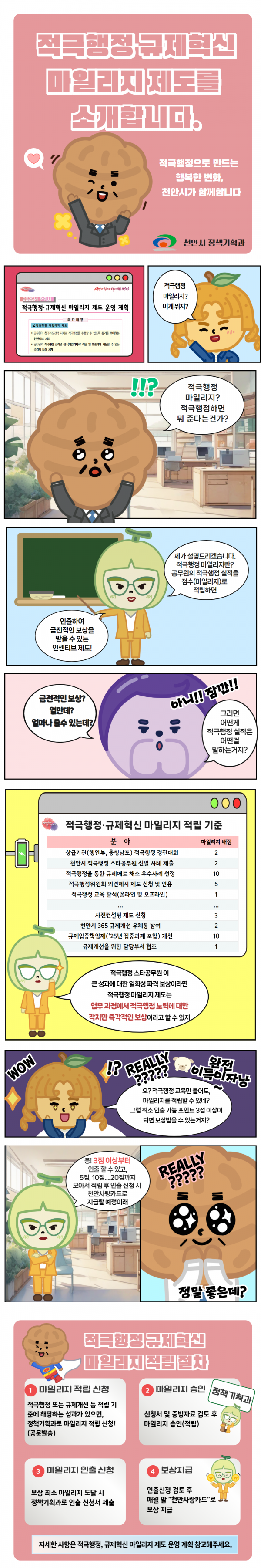 박상돈 천안시장은 “적극행정과 규제혁신을 통해 시민들에게 더 나은 행정서비스를 제공하고 공무원들이 자율적이고 창의적으로 업무를 수행할 수 있는 환경을 조성하는 것이 목표”며 “마일리지 제도가 공직사회에 새로운 동력을 불어넣을 것으로 기대한다”고 말했다.