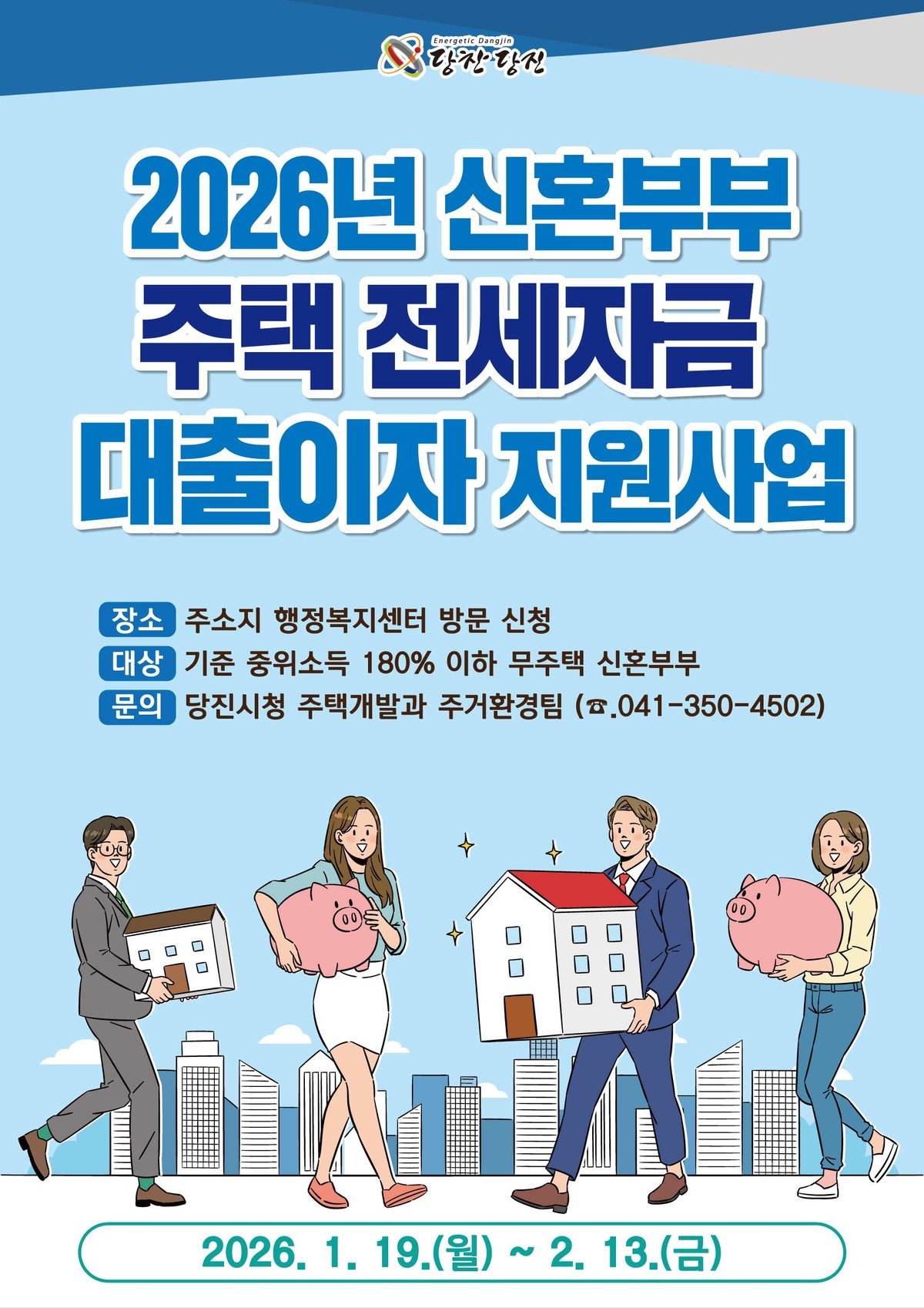 [충청25시] 당진시는 1월 19일부터 2월 13일까지 ‘2026년 신혼부부 주택 전세자금 대출이자 지원사업’신청자를 모집한다고 16일 밝혔다.