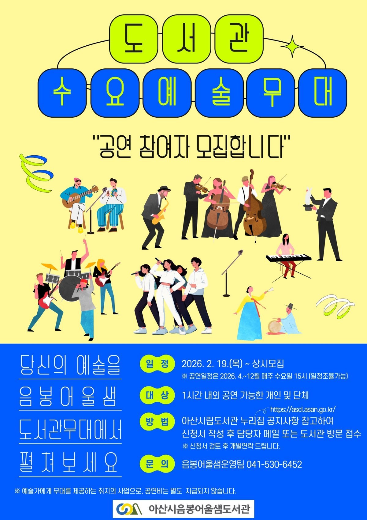 [충청25시] 아산시는 시민과 함께 즐길 수 있는 다양한 공연 활동을 도서관 공간에서 선보이는 ‘도서관 수요예술무대’를 운영하고 2026년 프로그램에 참여할 예술인과 단체를 상시 모집한다고 밝혔다.
