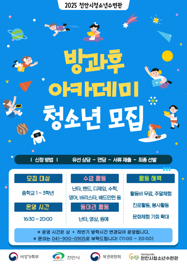 [충청25시] 천안시청소년재단 천안시청소년수련관은 2025년 방과후아카데미 신입생을 모집한다고 4일 밝혔다.
