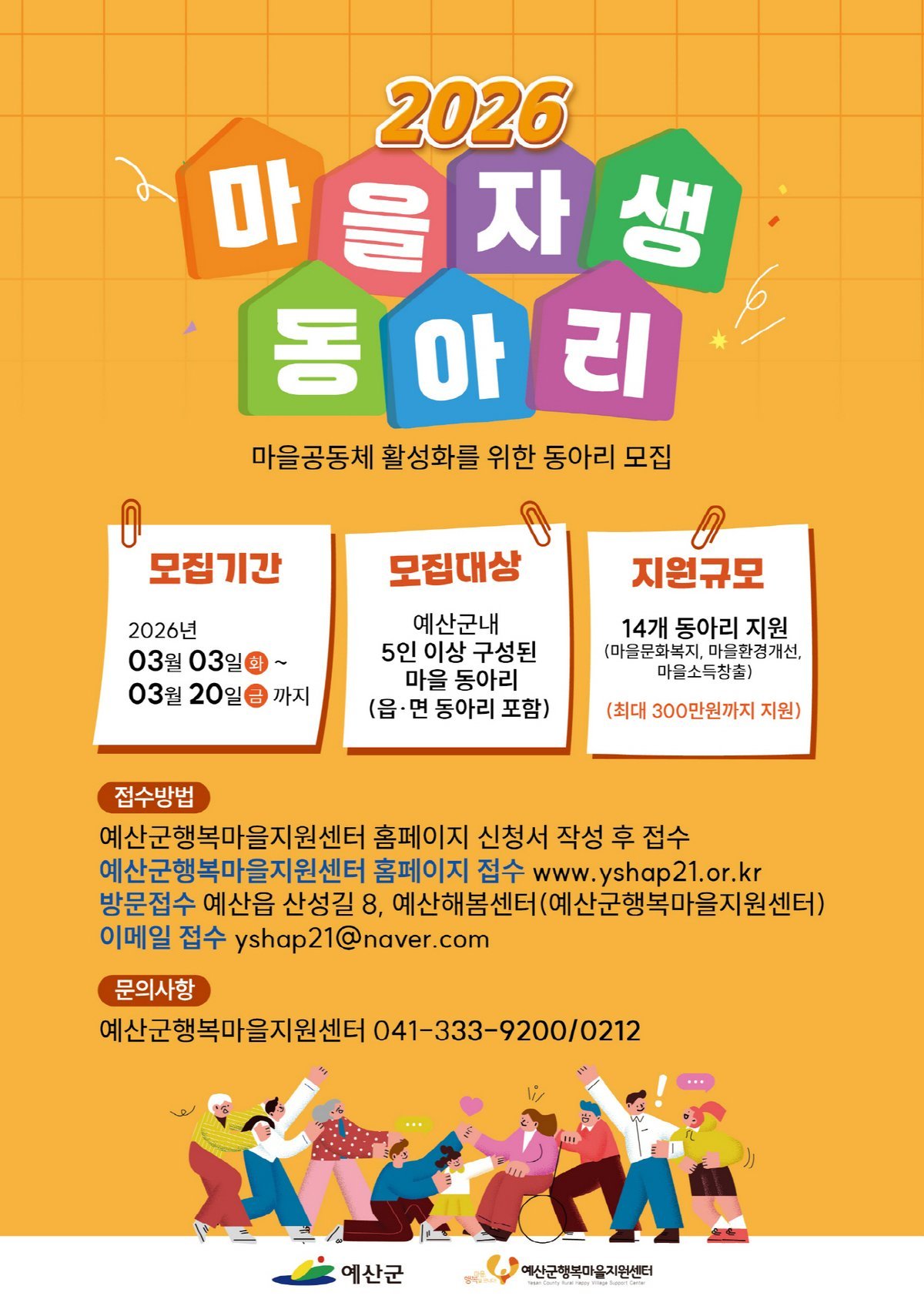 [충청25시] 예산군행복마을지원센터는 마을에 활력을 불어넣고 마을공동체 회복을 도모하기 위해 2026년 마을자생동아리를 3월 20일까지 모집한다고 밝혔다.