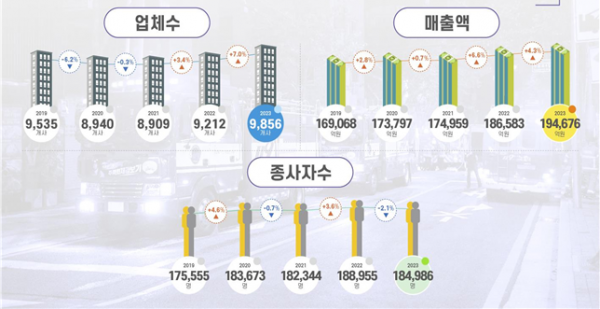 코로나19 확산 시기 주춤했던 업체 수는 2021년부터 점차 증가하기 시작해, 2023년에는 전년대비 7.0% 증가했고 매출액은 2020년 이후 꾸준히 증가세를 보이며 2023년 처음으로 19조원을 돌파했다.