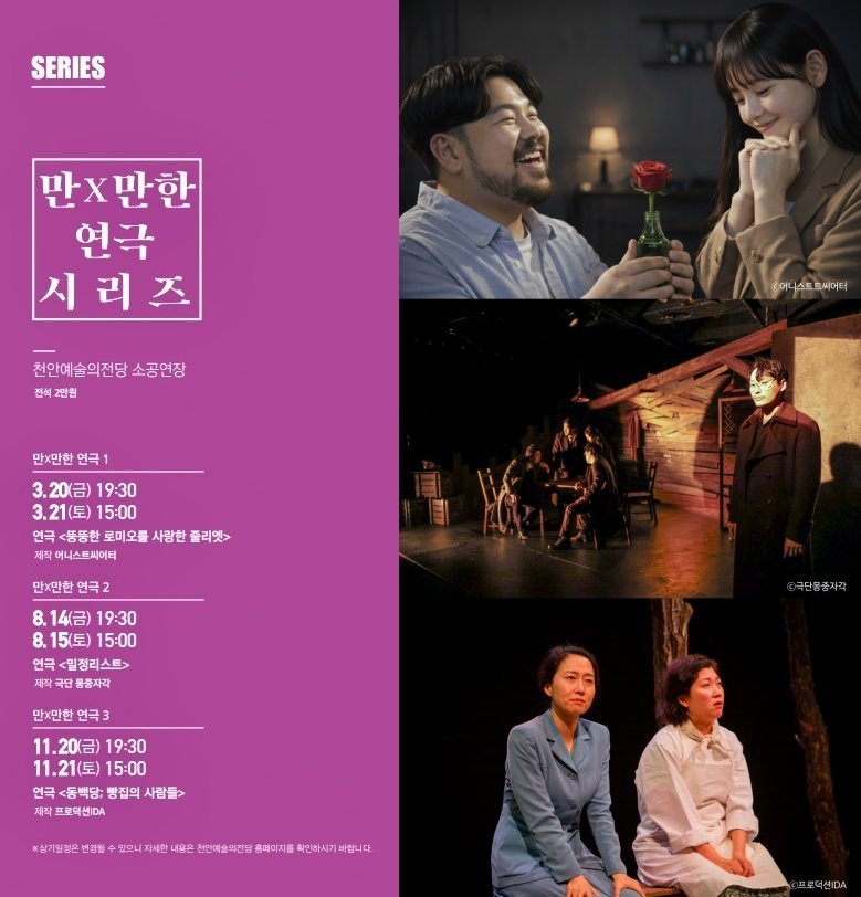 정승택 천안예술의전당 관장은 “시민들의 관람 문화를 활성화하고자 모든 공연의 좌석 가격을 2만원으로 책정해 문턱을 낮춘만큼 더 많은 관객들이 연극을 접하길 바란다”고 말했다.