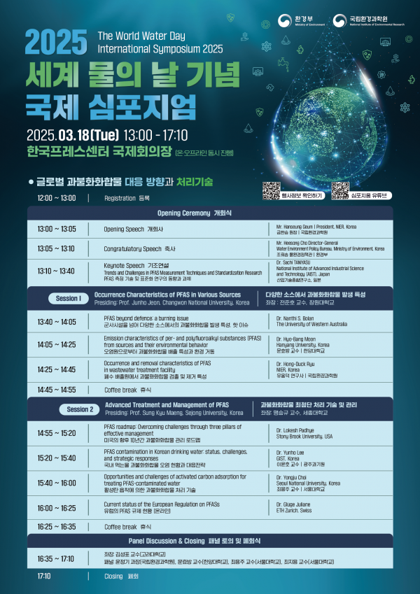 행사는 타니야스 일본 산업기술종합연구소 박사의 기조연설을 시작으로 △1부 다양한 오염원에서 과불화화합물 발생 특성, △2부 과불화화합물 최첨단 처리 기술 및 관리 등을 주제로 국내외 전문가들의 발표와 종합토론으로 진행된다.