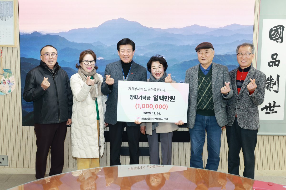 [충청25시] 사단법인금산군자원봉사센터 이사회는 지난 26일 금산군청에서 지역인재 육성을 위해 장학금 100만 원을 기탁했다.