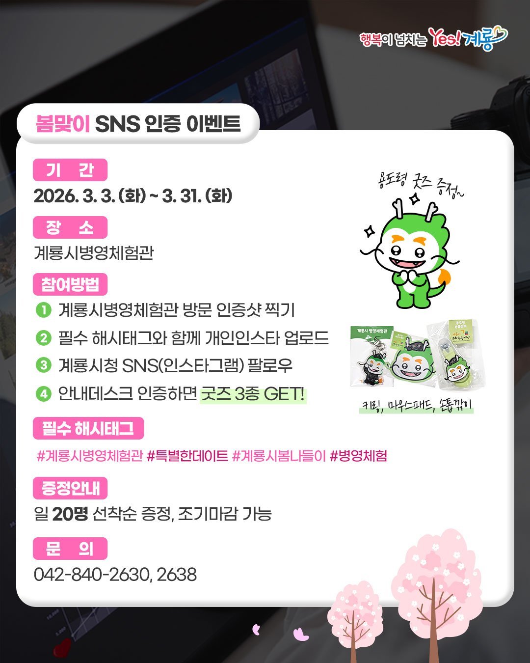 [충청25시] 충남 계룡시가 3월 한달 간 계룡병영체험관을 찾는 시민과 관광객을 대상으로 ‘봄맞이 SNS 인증 이벤트’를 진행한다.