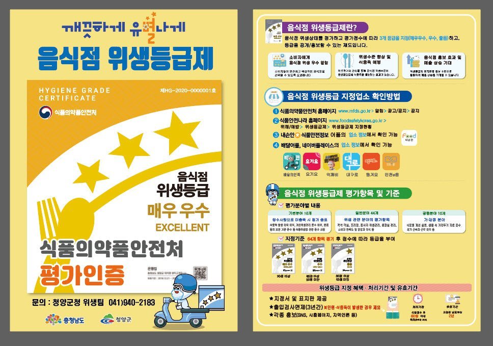 위생등급제 신청은 식품안전나라 온라인 접수 또는 청양군 행복민원과 위생팀 방문 접수로 가능하다.